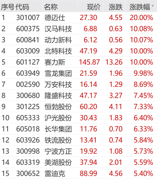 5月23日上午,汽车板块领涨A股市场。个股方面,德迈仕20cm涨停,汉马科技、动力新科、北特科技、雪龙集团等多股涨停。
