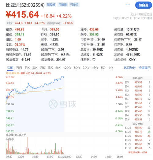 比亚迪涨超4%,股价最高触及416.98元/股,再创历史新高,总市值达1.26万亿元。