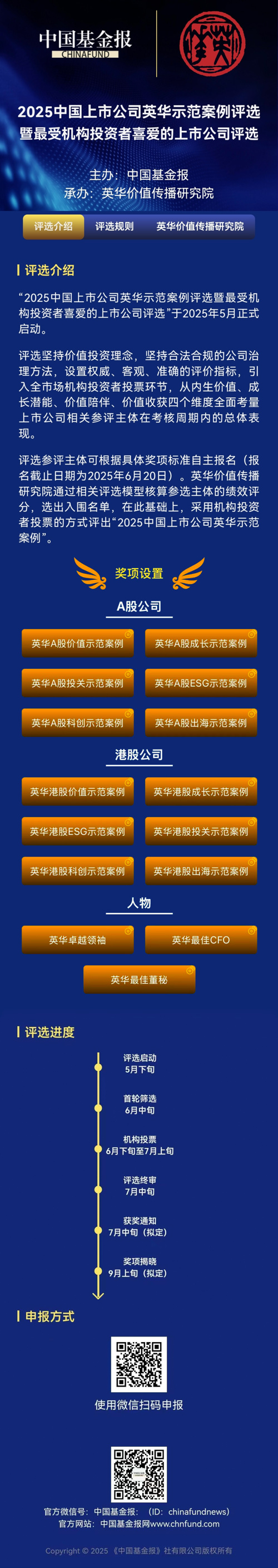 近日,2025中国上市公司英华示范案例评选暨最受机构投资者喜爱的上市公司评选正式启动。此次评选旨在促进中国资本市场高质量发展,倡导价值投资、长期投资导向,发掘中国价值,传递中国声音,为金融助力实体经济发展贡献力量。