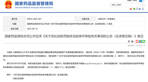 6月16日,为落实《国务院办公厅关于全面深化药品医疗器械监管改革促进医药产业高质量发展的意见》(国办发〔2024〕53号)有关要求,支持创新药研发,国家药监局发布了《关于优化创新药临床试验审评审批有关事项的公告(征求意见稿)》(以下简称征求意见稿),向社会公开征求意见。