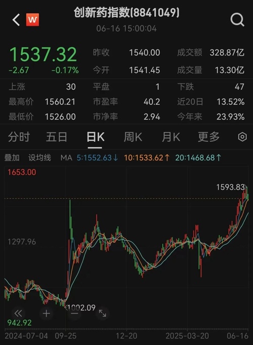 2024年9月24日至今,Wind创新药指数涨幅达53%。6月16日,Wind创新药指数为1537.32点,微跌0.17%。