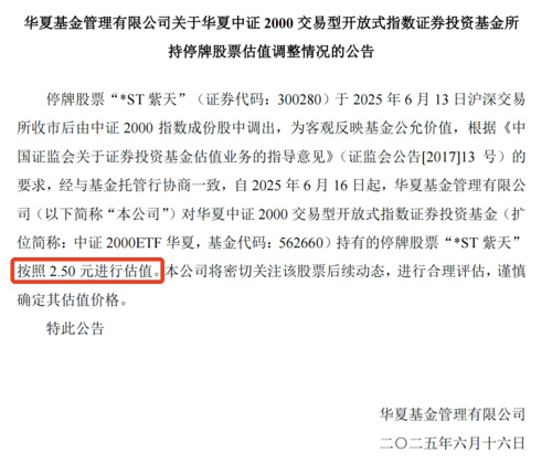 6月16日,华夏基金公告,停牌股票“*ST紫天”(证券代码:300280)于6月13日沪深交易所收市后由中证2000指数成份股中调出,为客观反映基金公允价值,根据《中国证监会关于证券投资基金估值业务的指导意见》的要求,经与基金托管行协商一致,自6月16日起,华夏基金对华夏中证2000ETF持有的停牌股票“*ST紫天”按照2.50元进行估值。