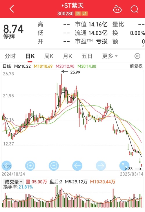 到了3月17日,该公司因未完成整改,股票首次停牌,停牌期限为2个月。5月6日,因未在法定期限前披露2024年年报,该公司股票继续停牌。若停牌满2个月仍未披露年报,将于7月7日复牌。5月20日,因整改逾期满2个月,该公司股票被正式实施退市风险警示,简称变更为“*ST紫天”。