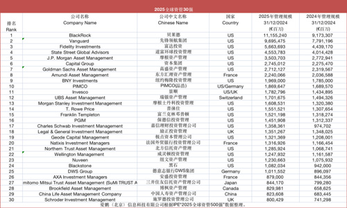 IPE指出,2025年榜单显示,头部资产管理机构凭借战略优势继续划分巨大市场份额,强化行业“马太效应”。一方面,全球500强资产管理公司总体资产管理规模达到历史高位,贝莱德、先锋领航、富达等头部机构,在市场份额及吸金能力方面领先。另一方面,行业分化加剧,中小型管理者面临竞争压力,市场份额和利润率或继续下滑。行业正在迈向“越大越强”的结构转型,投资者偏好集中于大型、稳健、风险分散的资管机构,中小资管公司则面临、差异化、专业化经营的压力。