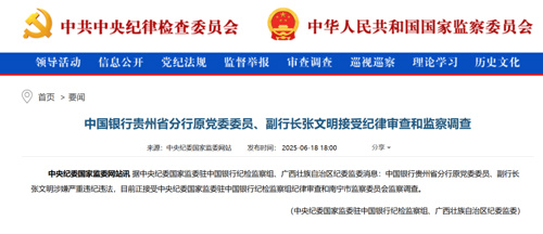 6月18日,中央纪委国家监委官网通报:中国银行贵州省分行原党委委员、副行长张文明涉嫌严重违纪违法,目前正接受中央纪委国家监委驻中国银行纪检监察组纪律审查和南宁市监察委员会监察调查。
