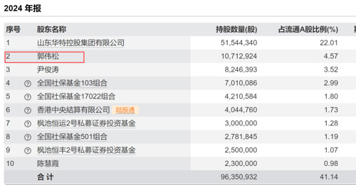 早在2024年一季报,郭伟松就已经现身华特达因前十大流通股股东名单,并于2024年年末成为第二大股东。