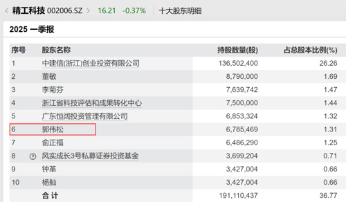 同时,郭伟松还现身精工科技前十大股东名单。公告显示,2024年12月,郭伟松通过定增成为精工科技第六大股东。