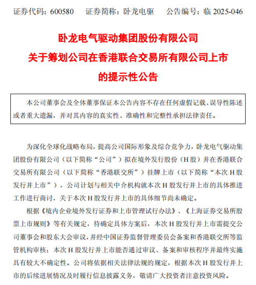 6月18日晚间,卧龙电驱(证券代码:600580)发布提示性公告,宣布拟在境外发行H股并在香港联合交易所主板挂牌上市,旨在深化全球化战略布局、提升国际竞争力。作为全球电机及驱动系统领域的领军企业,此次计划标志着其资本运作向“双资本平台”迈出关键一步。
