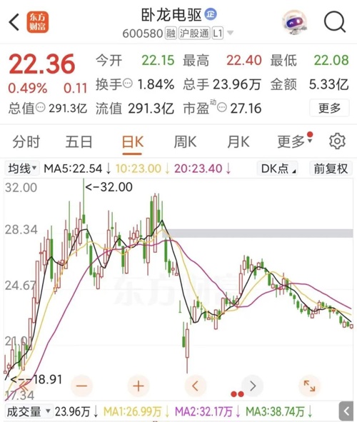 截至6月18日收盘,卧龙电驱股价当日涨0.49%至22.36元/股,总市值为291.3亿元。