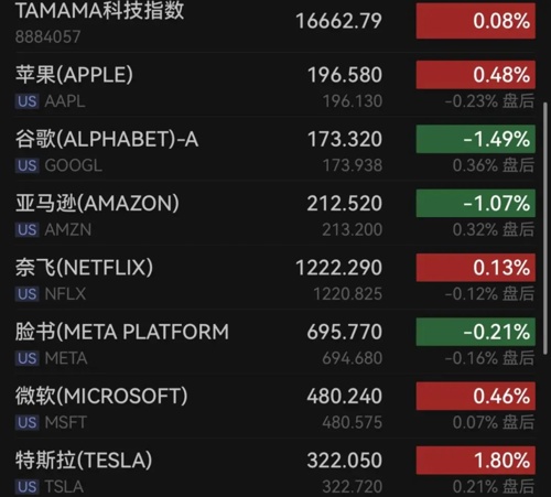 大型科技股涨跌不一,特斯拉涨逾1%,英伟达涨近1%,苹果涨0.48%,微软涨0.46%,脸书跌0.21%,亚马逊跌超1%,谷歌跌逾1%。