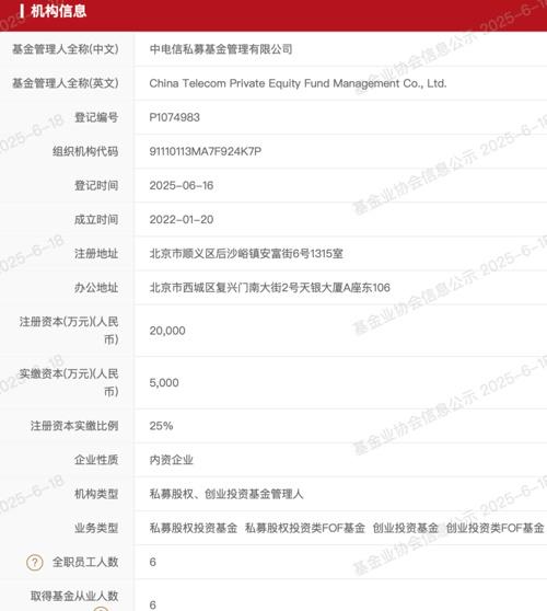 6月16日,中国证券投资基金业协会网站(以下简称协会)信息显示,中电信私募基金管理有限公司(以下简称中电信私募)完成备案登记,机构类型为私募股权、创业投资基金管理人。公司注册资本为2亿元,实缴资本为5000万元,注册地在北京市顺义区,办公地在北京市西城区,目前有6名全职员工。