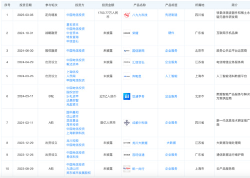 近年来,中国电信集团投资在市场上动作频频,投资主要集中在通信、云服务、大数据、人工智能、手机、电信增值业务等上下游产业链,包括2024年投资了荣耀、国信新网、汇信合弘、库帕思、世通亨奇、成都中科微等。