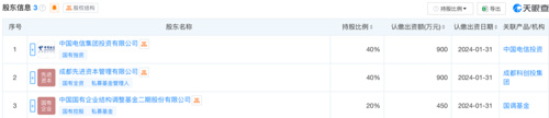 除了中电信私募,中国电信集团在2023年12月还成立了锦翼数智私募基金管理有限公司,注册资本为2250万元,其股东分别是中国电信集团投资、成都先进资本管理有限公司和中国国有企业结构调整基金二期股份有限公司,分别持股40%、40%和20%。