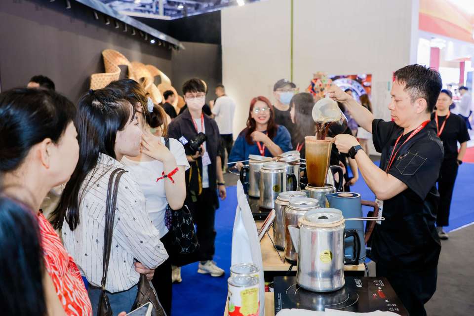 港式奶茶技艺传承人谢忠德泡制奶茶,吸引大批观众欣赏技艺与品尝美味。