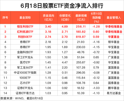 易方达基金数据显示,6月18日,跟踪港股科技指数的ETF单日净流入5.2亿元,跟踪红利和非银金融指数的ETF资金净流入分别达4.4亿元和4.1亿元,跟踪科创板50指数和黄金指数的ETF资金净流入分别为3亿元和2.7亿元。