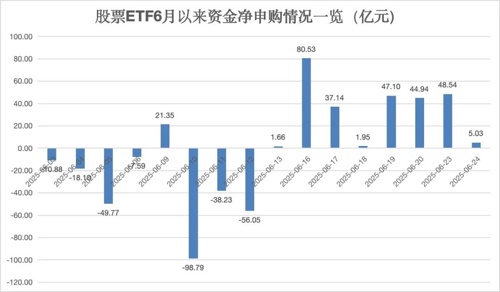 银河证券基金研究中心数据显示,6月24日,全市场股票ETF(含跨境ETF)单日资金净流入5.03亿元,这也是股票ETF连续8个交易日出现单日资金净流入。
