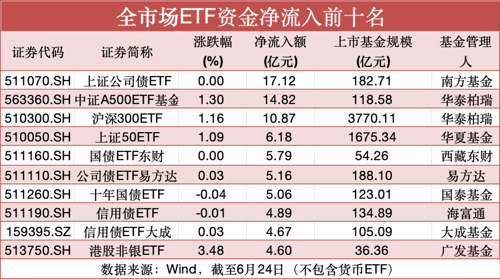 据Wind数据统计,全市场ETF资金流入前十名榜单,包括南方上证公司债ETF、易方达公司债ETF、海富通信用债ETF、大成信用债ETF在内的4只基准做市信用债位列其中,净流入金额分别达17.12亿元、5.16亿元、4.89亿元、4.67亿元。
