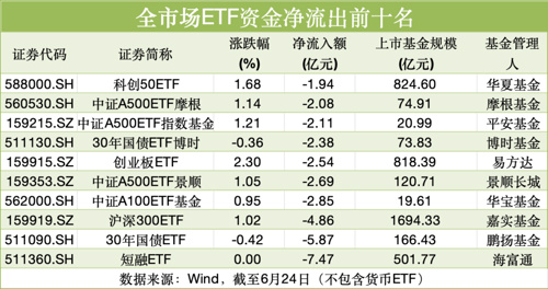 资金净流出方面,债券ETF中的短融ETF、30年国债ETF,股票ETF中的部分中证A500ETF遭到资金抛售,单日资金净流出居前。