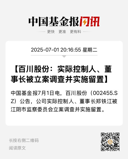 7月1日晚,百川股份发布公告称,公司收到实际控制人、董事长郑铁江家属的通知,其于近日收到江阴市监察委员会签发的关于郑铁江的《留置通知书》和《立案通知书》,郑铁江被立案调查并实施留置。
