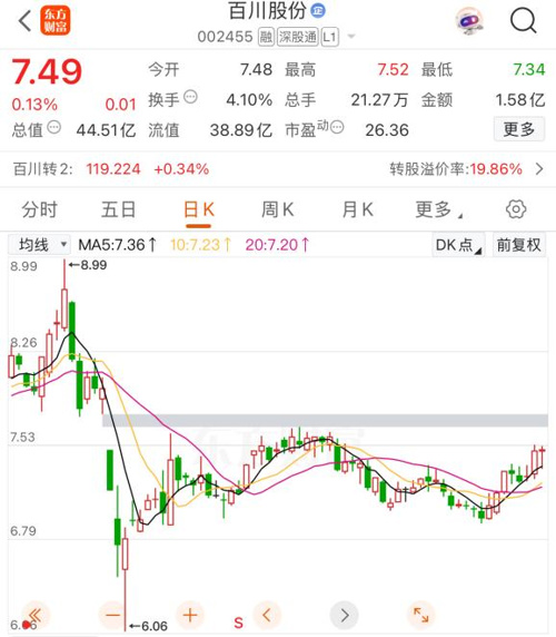 截至7月1日收盘,百川股份报收于7.49元/股,最新市值为44.51亿元。