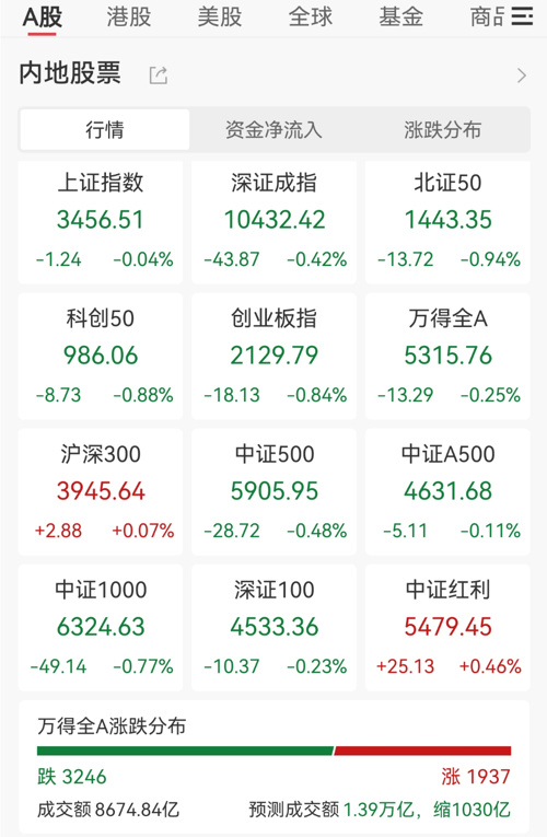 全市场半日成交额为8674.84亿元,较上日明显缩量;全市场1937只个股上涨,3246只个股下跌。