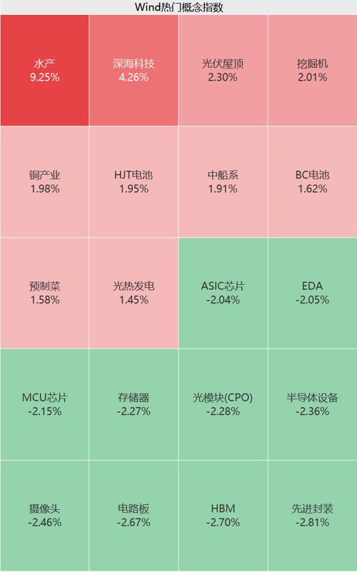 盘面上,受海洋经济利好消息影响,水产、深海科技概念股飙涨;光伏屋顶、挖掘机、HJT电池、中船系等概念股走高,银行板块午前拉升;通信设备、先进封装、半导体设备、光模块等概念股走低。