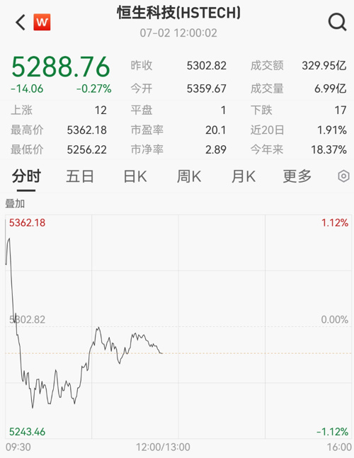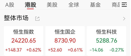 港股市场上,恒生科技指数盘初跳水,随后逐步收复失地。截至午间收盘,恒生指数涨0.62%,恒生科技指数跌0.27%,恒生国企指数涨0.61%。