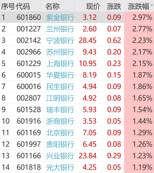 7月2日,银行板块午前集体拉升。截至午间收盘,紫金银行涨近3%,兰州银行、宁波银行、苏州银行、上海银行等涨超2%。