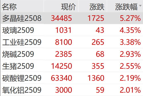 同时,上午多晶硅主力合约涨超5%,玻璃、工业硅等品种的主力合约均有明显涨幅。