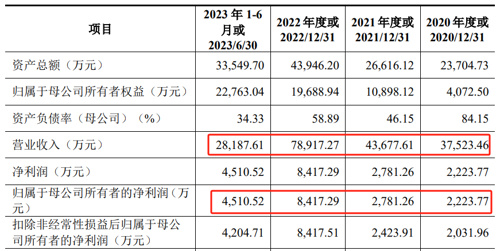 从彼时的招股书来看,亿联无限称得上是高增长的优质标的,从2020年到2023年上半年三年又一期,其营业收入分别是3.75亿元、4.37亿元、7.89亿元和2.82亿元,归母净利润是2223万元、2781万元、8417万元和4510万元。