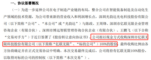 记者注意到,光韵达实际上在今年4月16日首次披露过收购亿联无限事宜,彼时其称与陈政、王周锋、亿联无限企业管理、博远智联、王鹏飞签署了《股份转让意向协议书》,公司拟以现金方式收购亿联无限100%的股份。本次交易最终完成后,公司将持有亿联无限100%股份,以取得对标的公司的控制权。