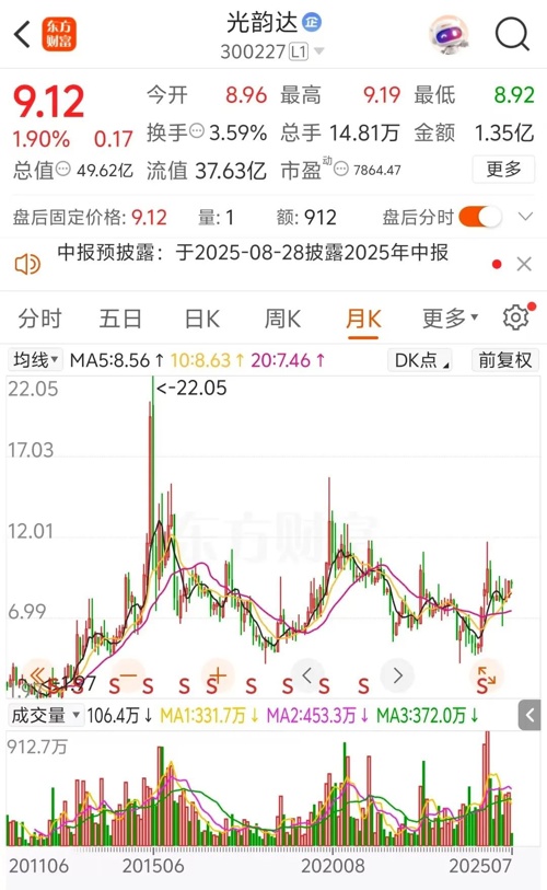 光韵达则是一家激光智能制造解决方案与服务提供商,于2011年6月8日在创业板上市,公司近年业绩表现也不佳,自2020年以来净利润经历了从持续下滑到亏损的过程。截至7月8日收盘,光韵达的市值是49.62亿元。