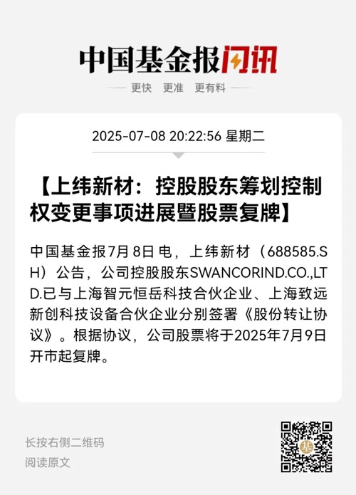 上纬新材公告称,智元恒岳及其股东拟获公司控股权,是因为认同公司的长期价值,以及A股资本市场对科技创新和产业创新的服务能力。