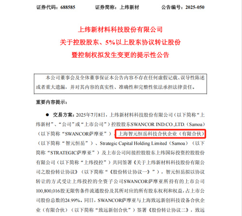 7月8日晚间,上纬新材发布公告称,公司控股股东将易主上海智元恒岳科技合伙企业(有限合伙)(以下简称智元恒岳),实控人将变为邓泰华。