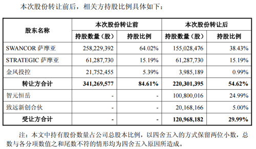 公告显示,7月8日,SWANCOR IND.CO.,LTD.(Samoa)(以下简称SWANCOR萨摩亚)、智元恒岳、Strategic Capital Holding Limited(Samoa)(以下简称STRATEGIC萨摩亚)、上纬国际投资控股股份有限公司(以下简称上纬投控)共同签署了《股份转让协议一》。