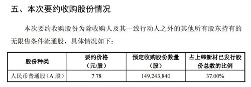 公告显示,此次要约价格为7.78元/股,要约收购上纬新材37%股份的总价款为11.61亿元。