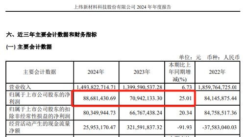 2024年,上纬新材的归母净利润为8868.14万元,同比增长25.01%;扣非后净利润为8034.99万元,同比增长20.34%。