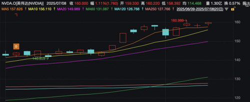 英伟达涨1.11%报每股160美元,股价创历史新高,公司总市值超过3.9万亿美元。