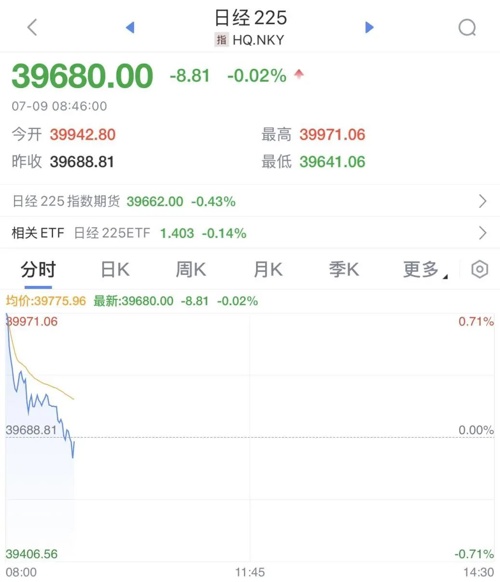 7月9日早间,日韩股市高开,日本股市盘中震荡下探,截至发稿,日经225指数跌0.02%。