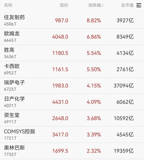 个股方面,住友制药涨超8%,欧姆龙、胜高、卡西欧等涨超5%;而富士通、任天堂、三菱重工等跌幅居前。