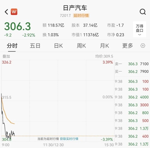 日产汽车早盘快速下探,一度跌超3%。