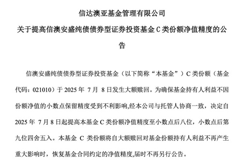 7月9日,信达澳亚基金发布旗下信澳安盛利纯债基金调整份额净值精度的公告。公告显示,该基金C类份额于2025年7月8日发生大额赎回,为确保基金持有人利益不因净值的小数点保留精度受到不利影响,公司决定自当日起提高该基金C类份额净值精度至小数点后八位,小数点后第九位四舍五入。