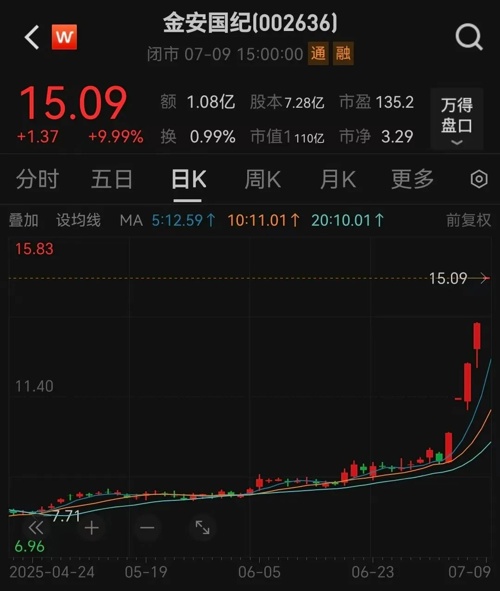 值得注意的是,股价已经连续5连板的金安国纪,7月9日盘后公告称,预计2025年上半年归属于上市公司股东的净利润为1500万元~2250万元,同比下降78.56%~67.83%;扣除非经常性损益后的净利润预计为6000万元~8000万元,同比增长4700%~6300%。