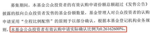 117家网下投资者管理的566个有效报价配售对象对应的有效认购基金份额数量为2,707,970万份,网下投资者有效认购申请确认比例为0.77548865%。公众投资者的有效认购基金份额数量为3,440,025万份,公众投资者配售比例为0.26162600%。