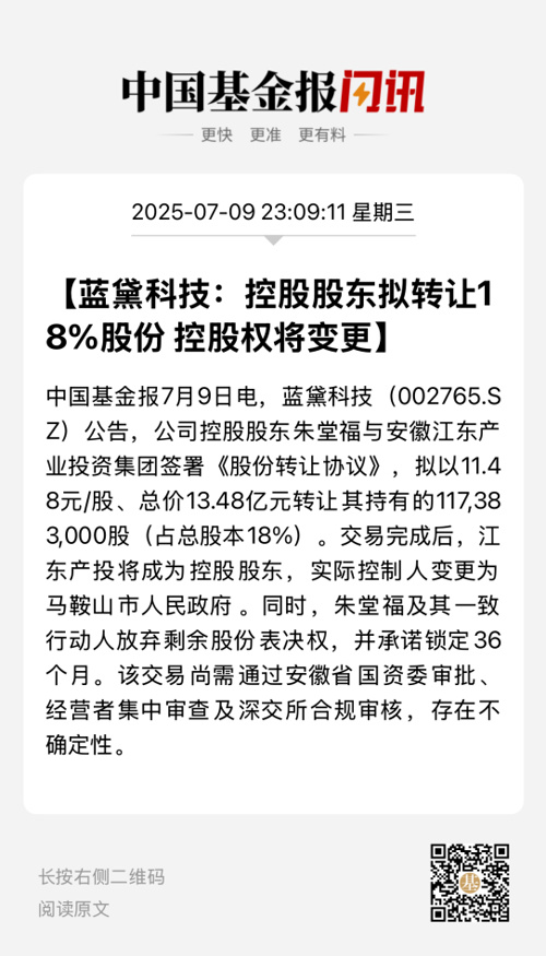 7月9日,蓝黛科技发布公告称,公司实际控制人朱堂福、熊敏、朱俊翰于2025年7月9日与安徽江东产业投资集团有限公司(以下简称江东产投)签订《股份转让协议》,朱堂福拟向江东产投转让其持有的公司1.17亿股股份,占公司总股本的18%。