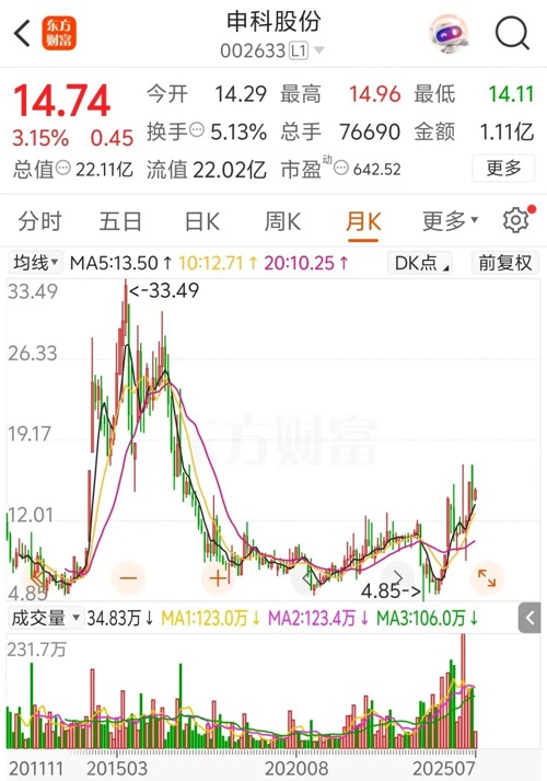截至7月9日收盘,申科股份的总市值为22.11亿元。