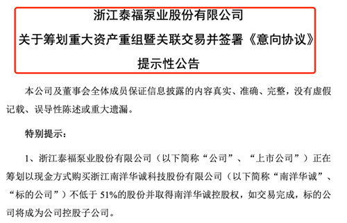 根据公告,7月9日,泰福泵业与南洋华诚股东邵雨田、冯江平和林富斌签署了相关意向协议,拟以现金方式收购南洋华诚不低于51%的股份并取得南洋华诚控股权,具体收购比例以正式协议约定为准。