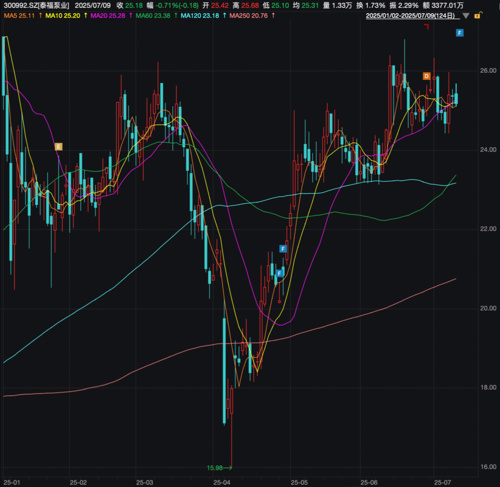 截至7月9日,泰福泵业报收于25.18元/股,最新总市值为24亿元。