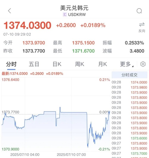 韩国央行宣布维持基准利率不变后,美元兑韩元汇率变化不大。