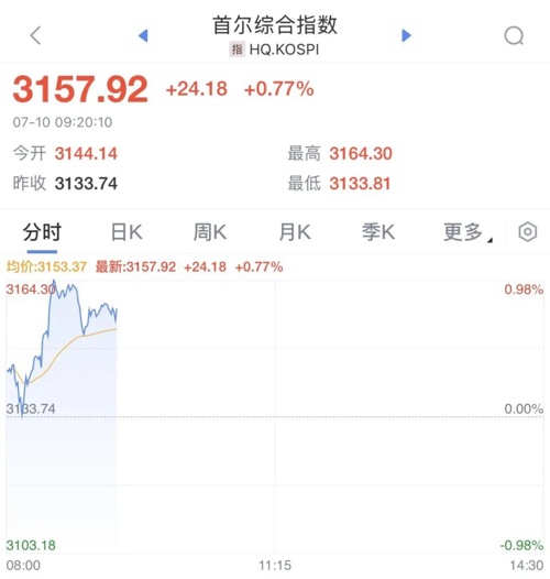 韩国KOSPI指数震荡拉升,一度涨近1%。